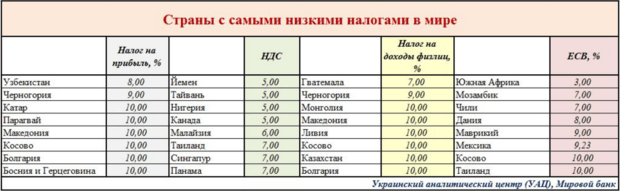 «Это данные Мирового банка за 2015 год. Из перечня стран специально исключены страны-офшоры. Как видите, Украина только по одному показателю входит в перечень стран с самыми высокими налогами. Может, поэтому МВФ постоянно требует от Украины повысить налоги. Есть еще запас», – считает эксперт.